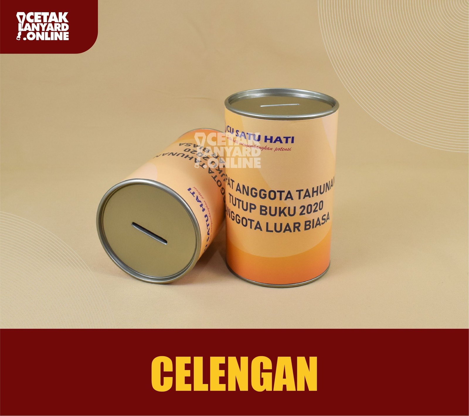 Kelebihan pesan celengan di tempat kami adalah bagian luar celengan tersebut dapat dicetak desain custom sesuai dengan keinginan Anda seperti nama dan logo yayasan/lembaga tempat Anda bernaung, nama/judul penggalangan dana, misalkan “penggalangan dana untuk korban banjir di kota XXX” maupun nama takmir masjid/musholla.